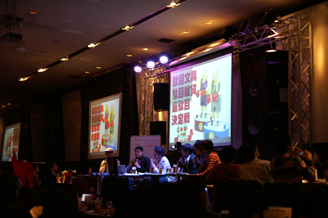 その右には、文具王、デイリーポータルZのウェブマスター林さん、雑貨メーカーのラ シェールの喜多村さんが座られ、審判団ということでジャッジを繰り広げるのです。