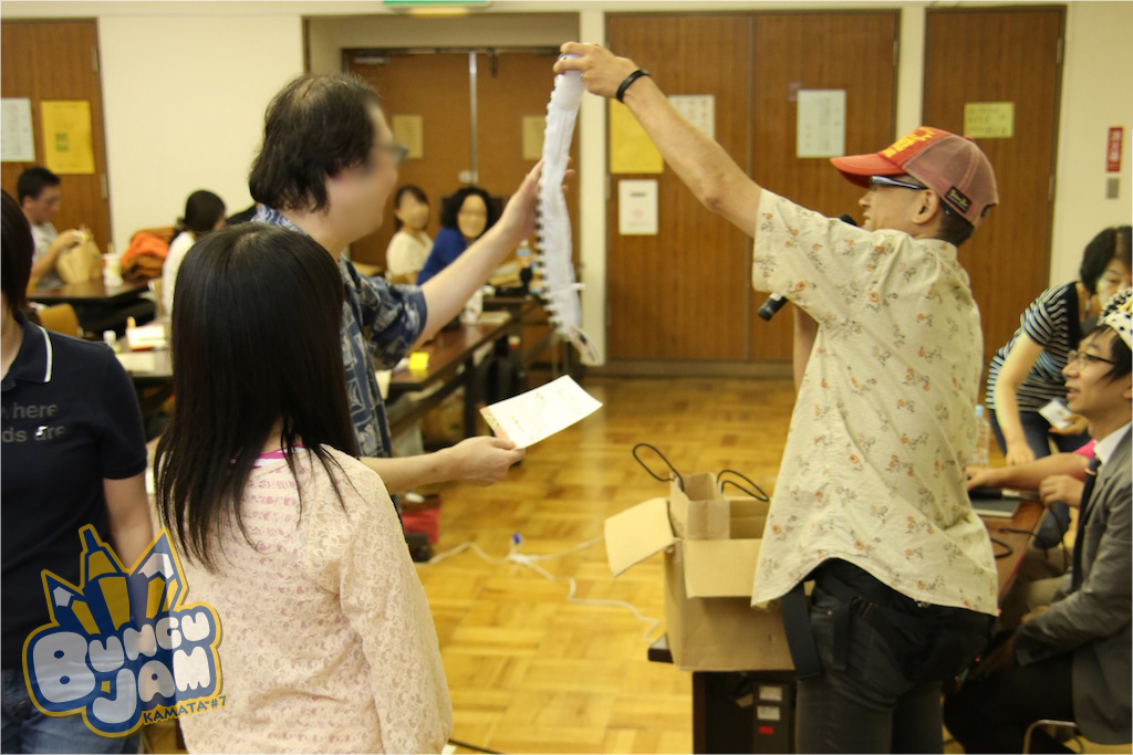 休憩時、お土産の中に特別封入させていただいた当たり券の引き替え風景です。