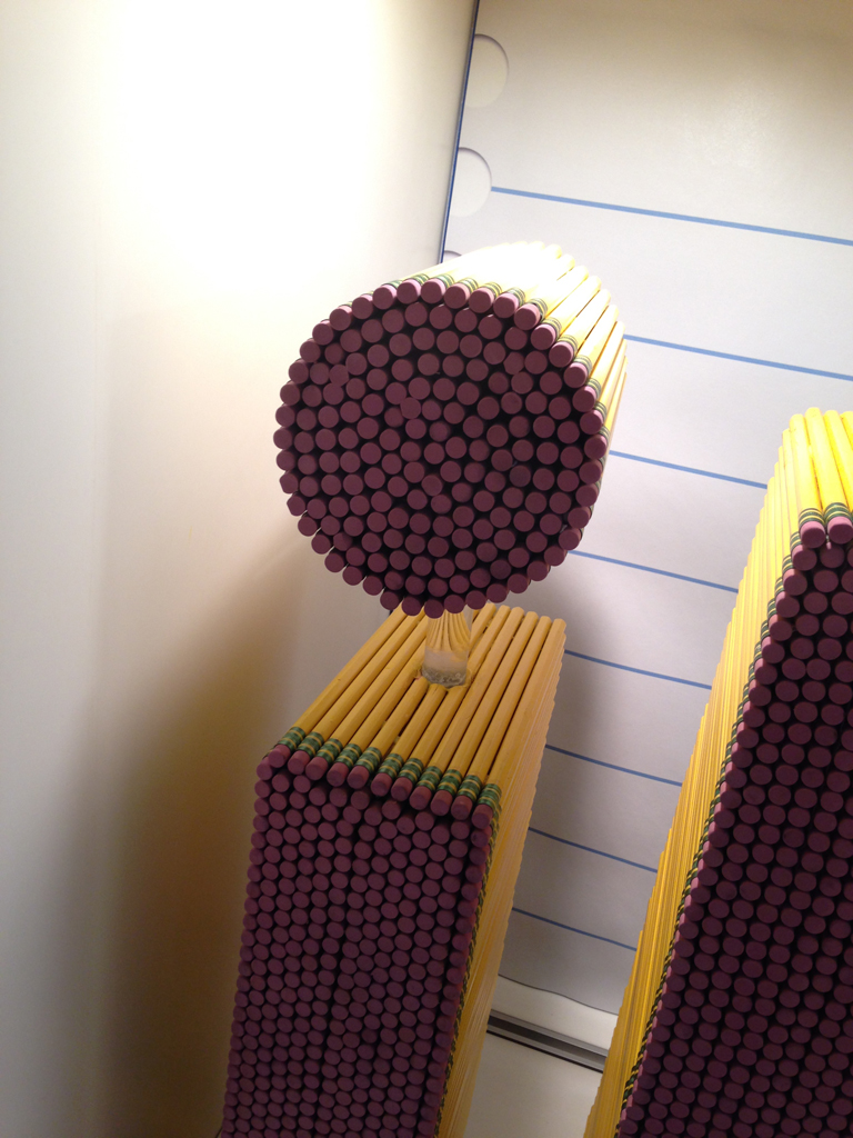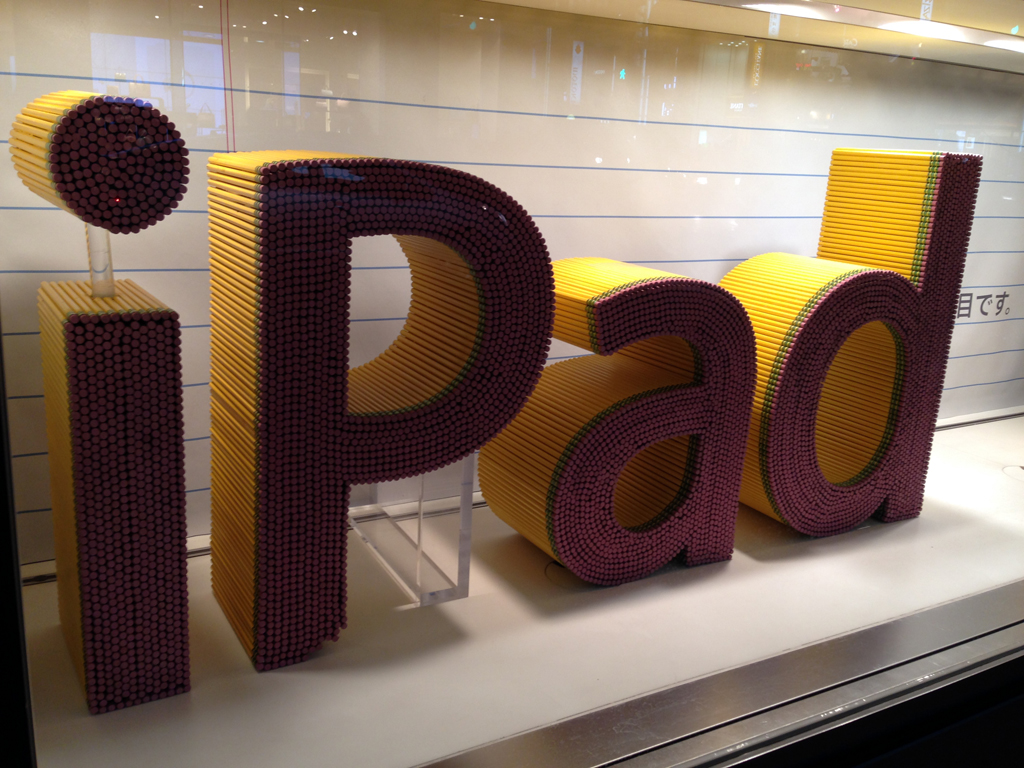2月からアップルストア銀座のウインドウに飾られている、イエローペンシルのオブジェたち。