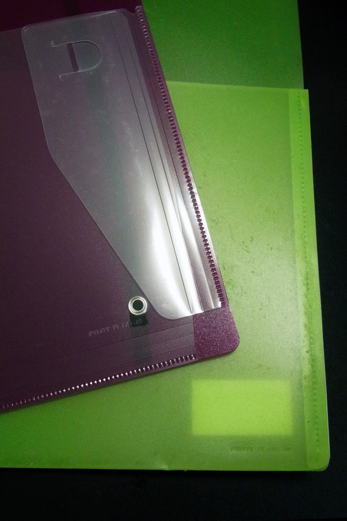 旧タイプ(緑)は用紙を入れるためにマチがあり、最初からヘリがボックス状に幅を持っています。