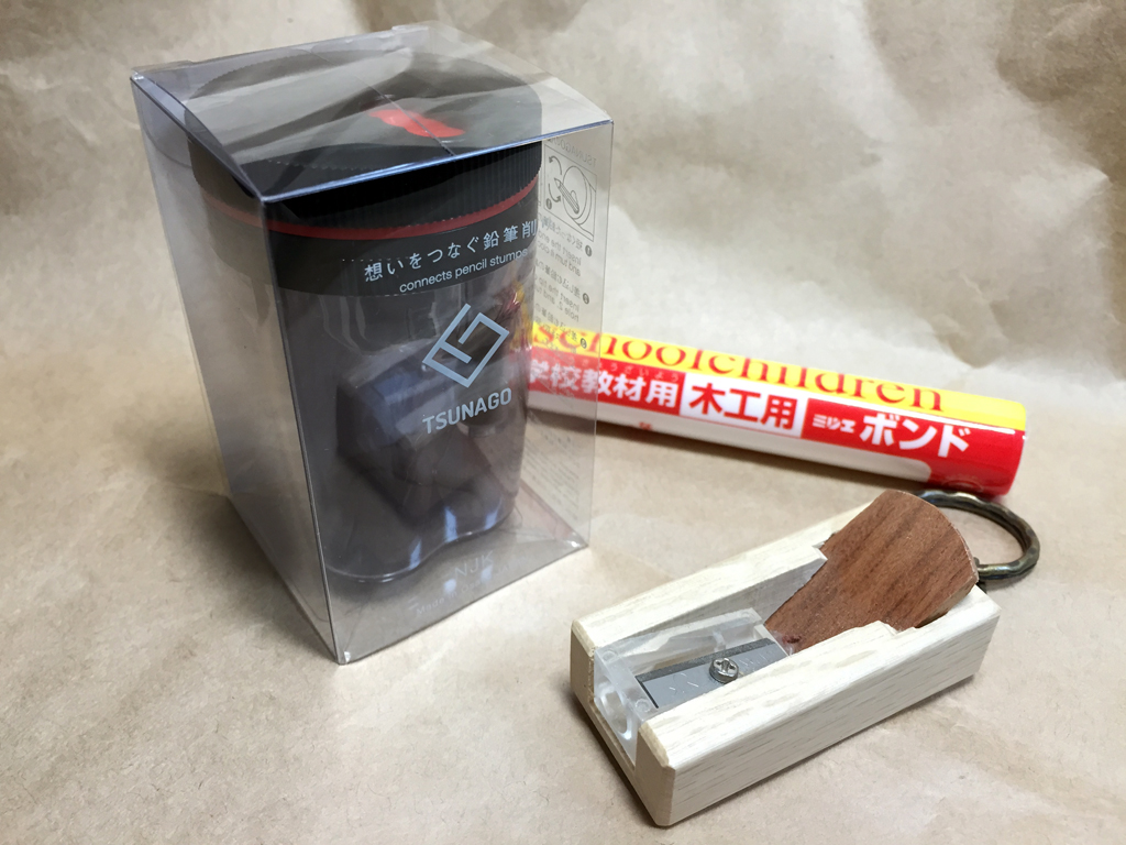 左が、中島重久堂の「短くなった鉛筆をつなぐための鉛筆削り器」TSUNAGO。