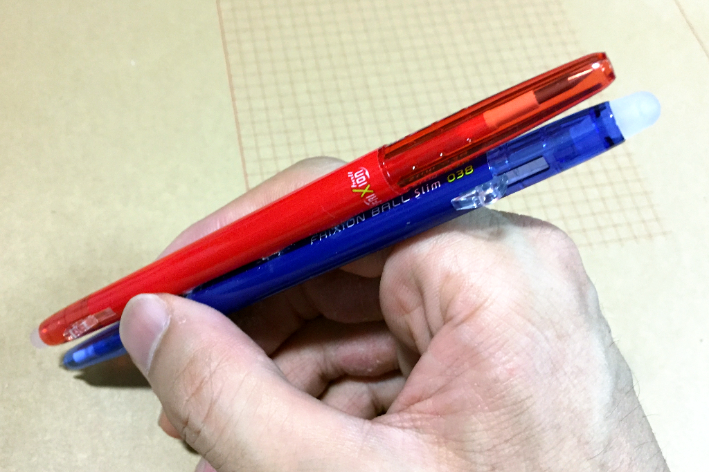 一枚目の写真のニコペンみたいに、フリクションボールスリム0.38が2本平行で並んでいて、こう縦に積んでるみたいな形になればな、と。