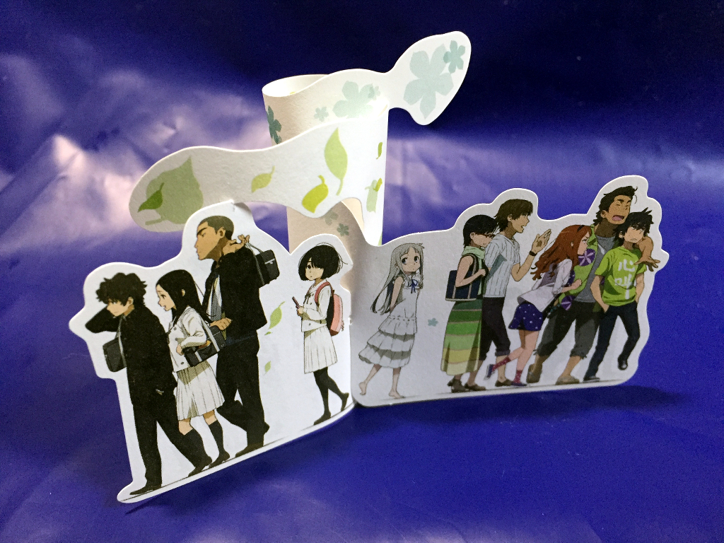 『あの花』は『ここさけ』と同じスタッフによる、やはり同じく秩父市を舞台にした青春物語でした。それぞれの世界観を現す「葉」と「花」が螺旋を描いてキャラたちの上を舞っています。