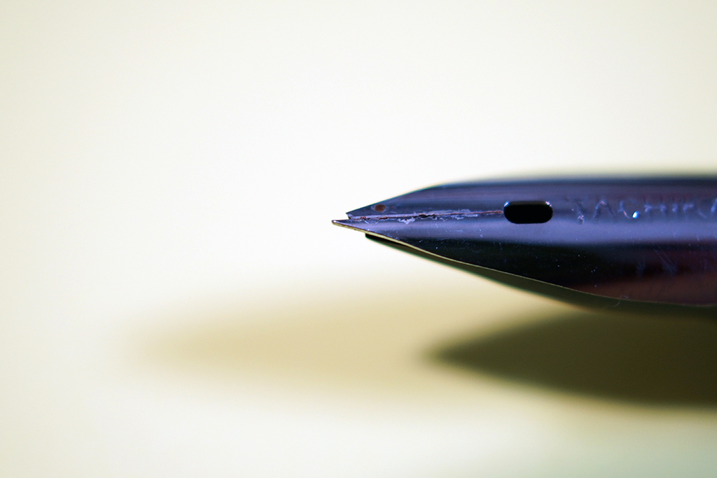 スクールペンに似た硬さの白ペンに、万年筆の機構である櫛溝とカートリッジで内部からインキを供給する、「つけないつけペン」です。