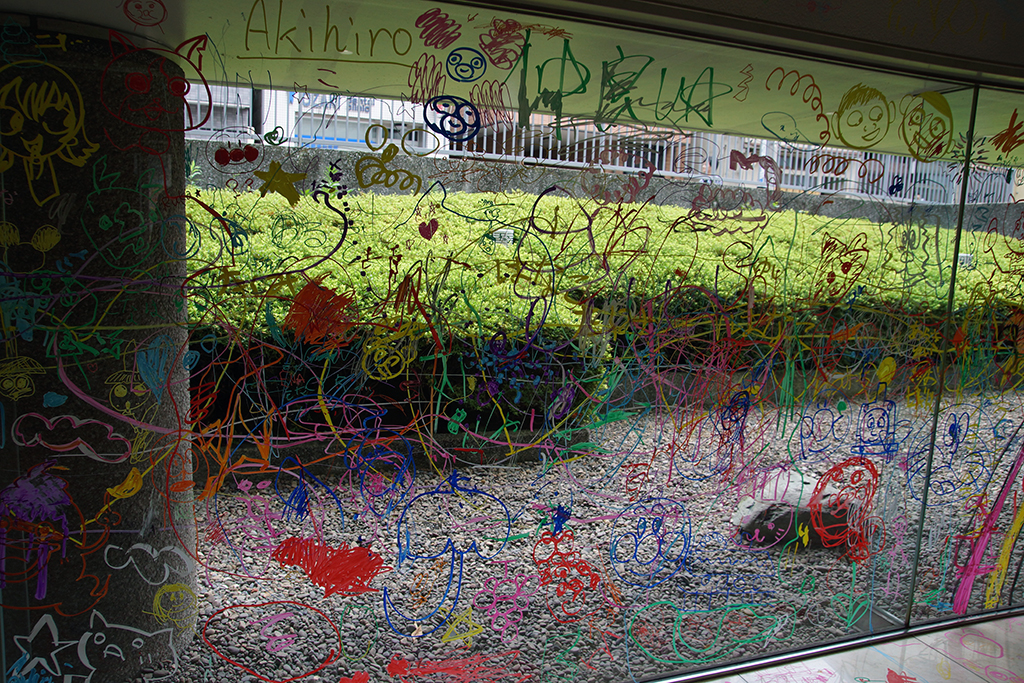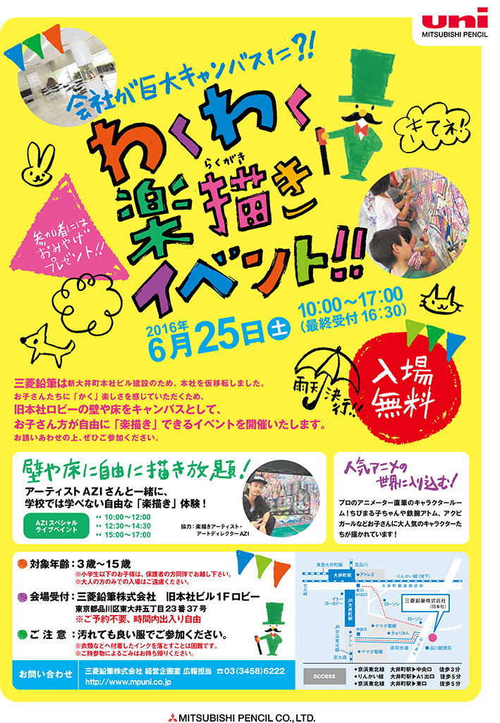 「わくわく楽描きイベント!!」と題されたこの会は、旧本社一階部分を解放し、子供たち(3歳から15歳まで)に思いっきり壁や床や窓に落書きをしてもらおう! という太っ腹な企画です。