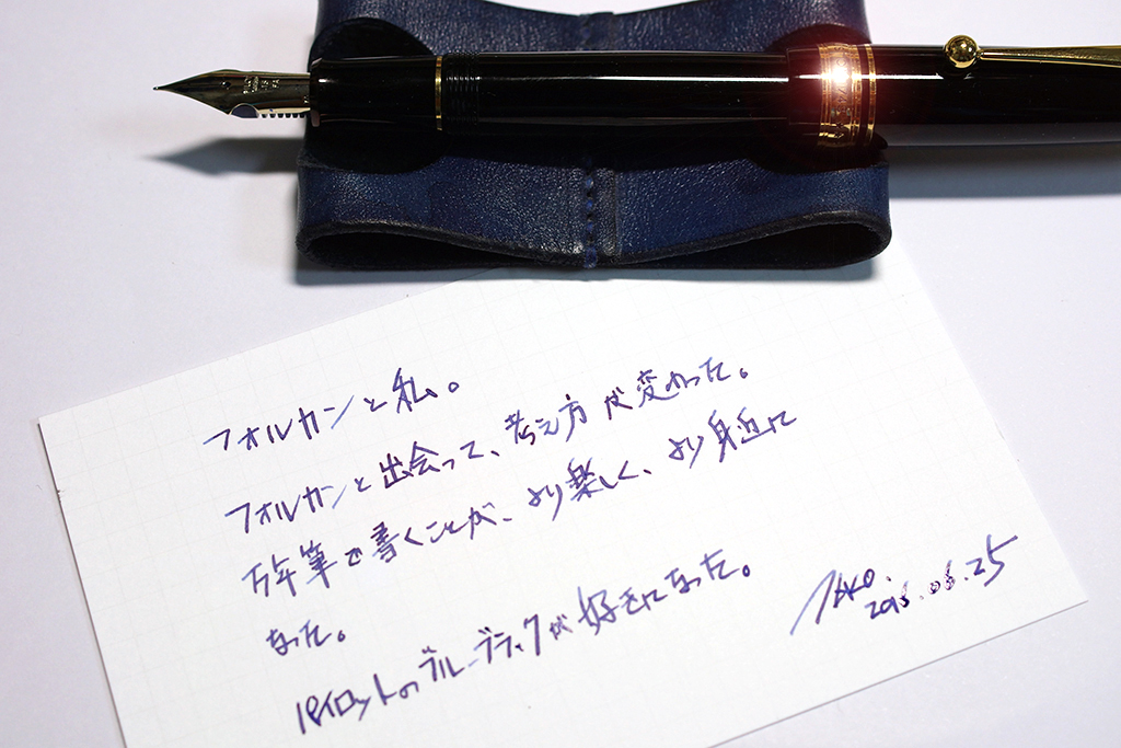 フォルカンは柔らかい分、インキ吐出量も多くなります。そして入れているのは、継続してパイロットのブルーブラックです。体感上、この世で最も裏抜けしやすいインキだと思っています。