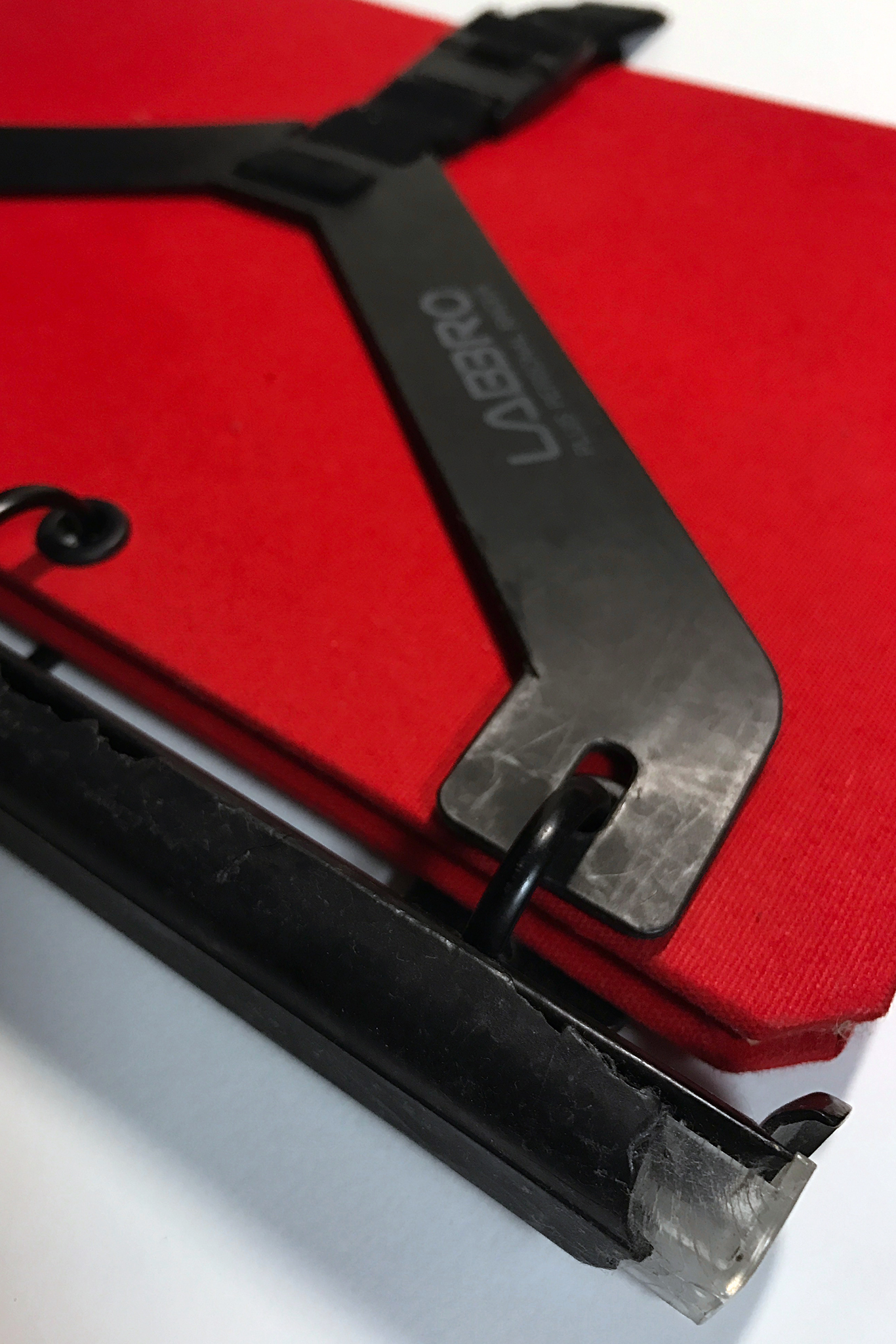 A4判4穴、ボディはベルトで固定され、金具は剥き出しという野心的デザインのバインダーです。