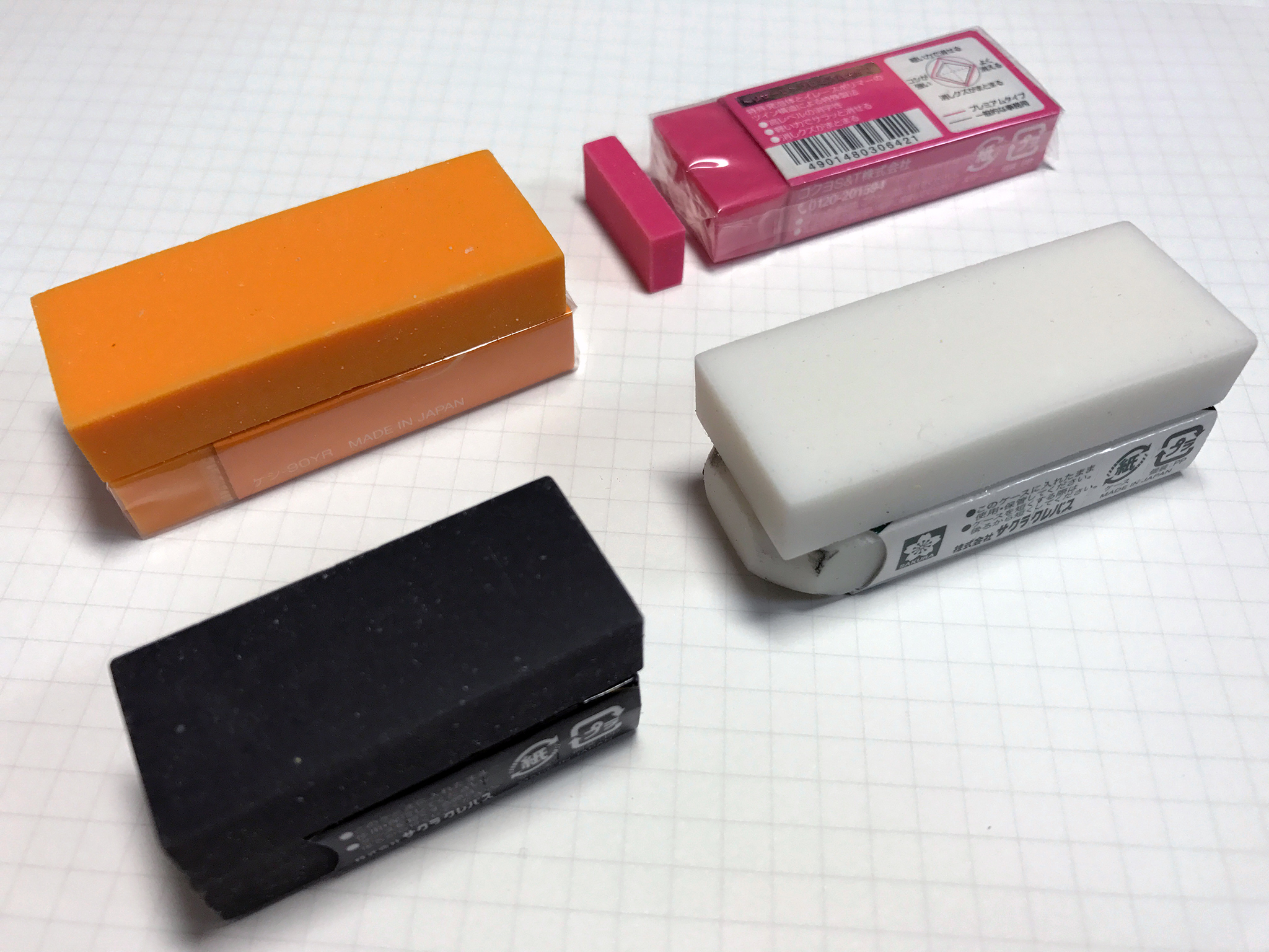 このミツヤのお買い得消しゴム、見つけるたびに購入しているのですが、最近はこんなカラフルな消しゴムも入るようになったんですね。