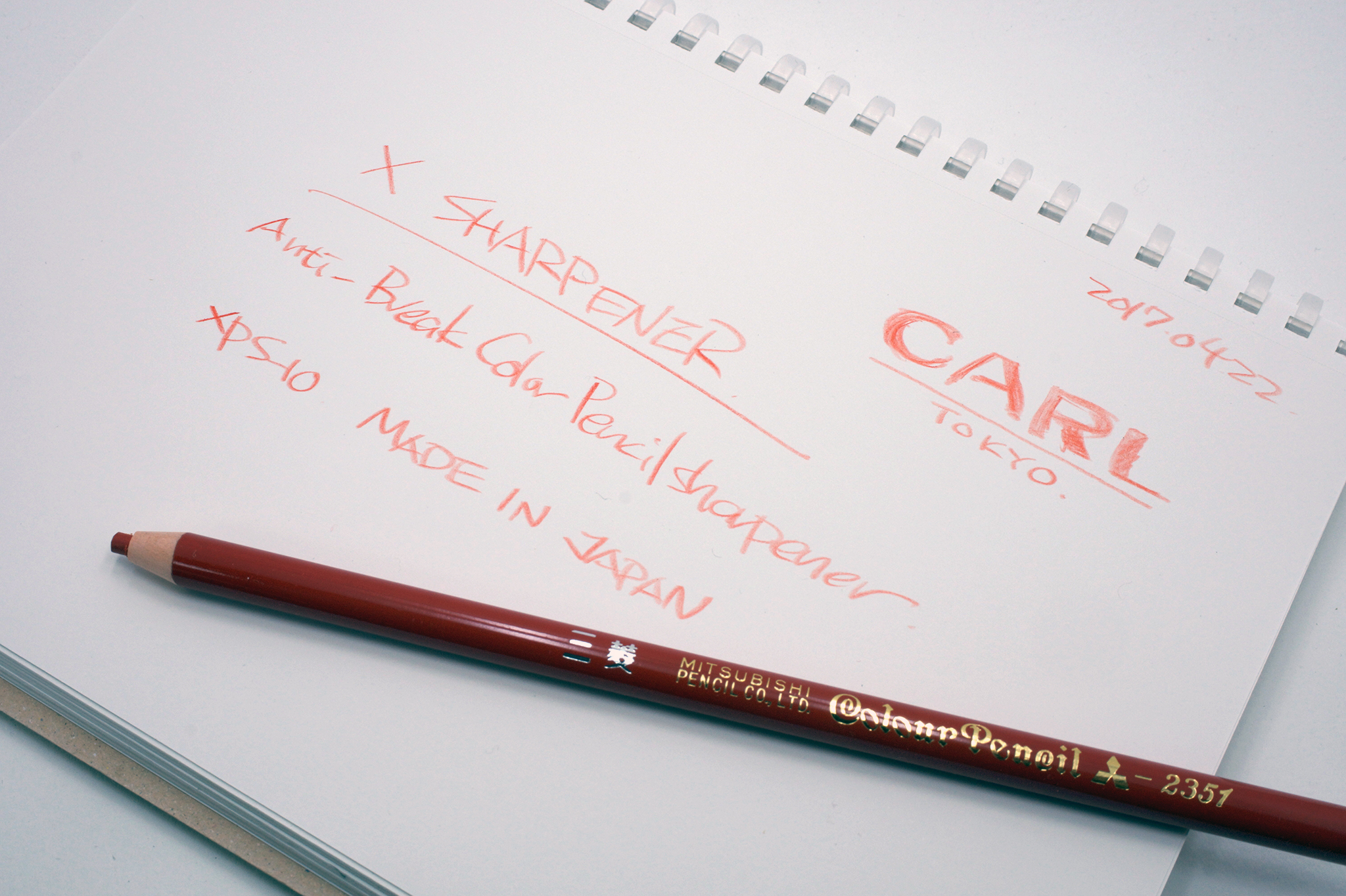 「落下衝撃で芯が折れない赤鉛筆」(正確には「中心軸にずれがなく、軸である木と芯の間の隙間がないため中で折れにくい赤鉛筆」)を北星鉛筆に特注してもらった上での実験です。
