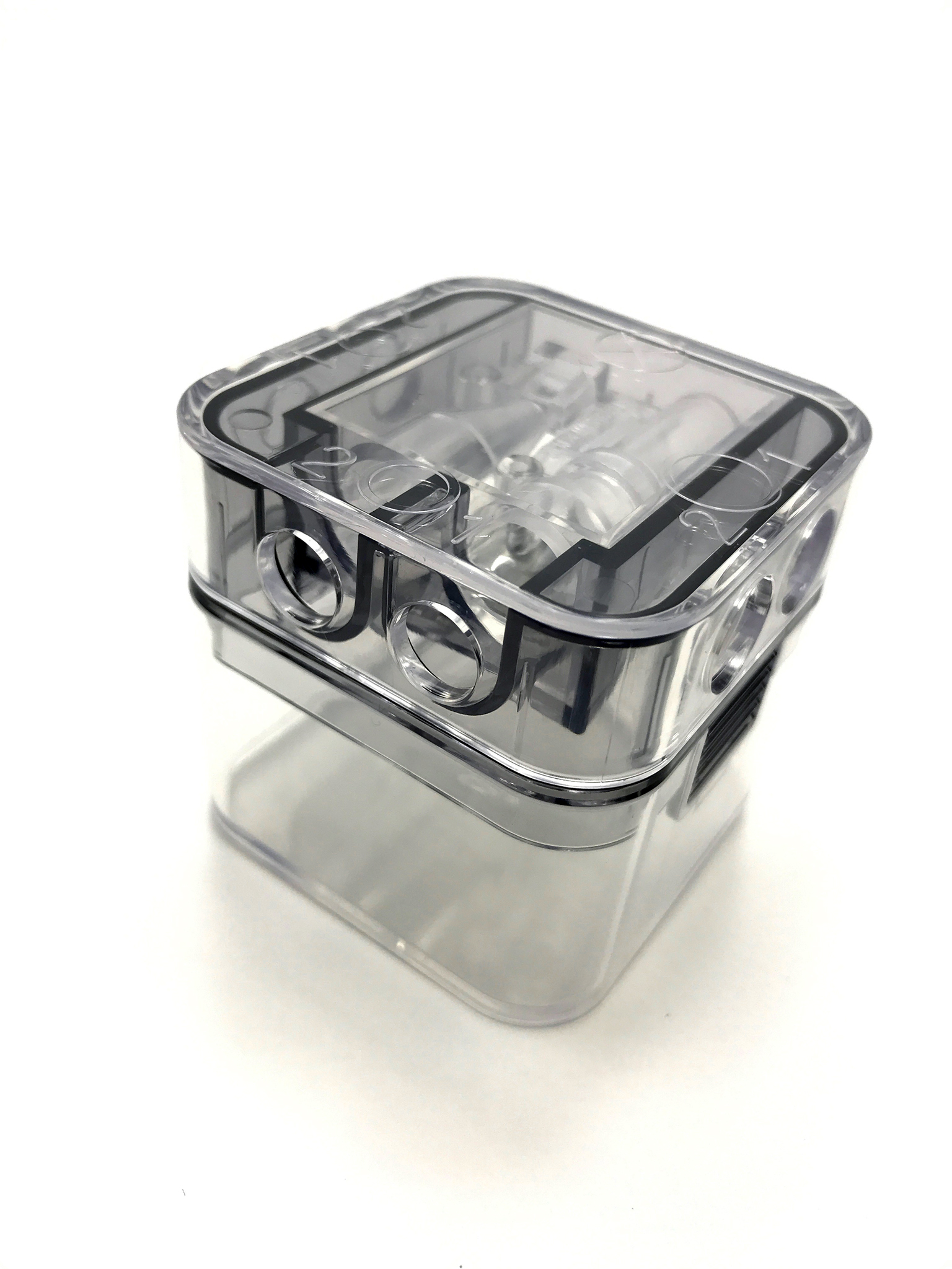 パッケージから取り出すと、何やらキューブ状の本体が出てきます。50ミリ四方、高さ48ミリってとこでしょうか。
