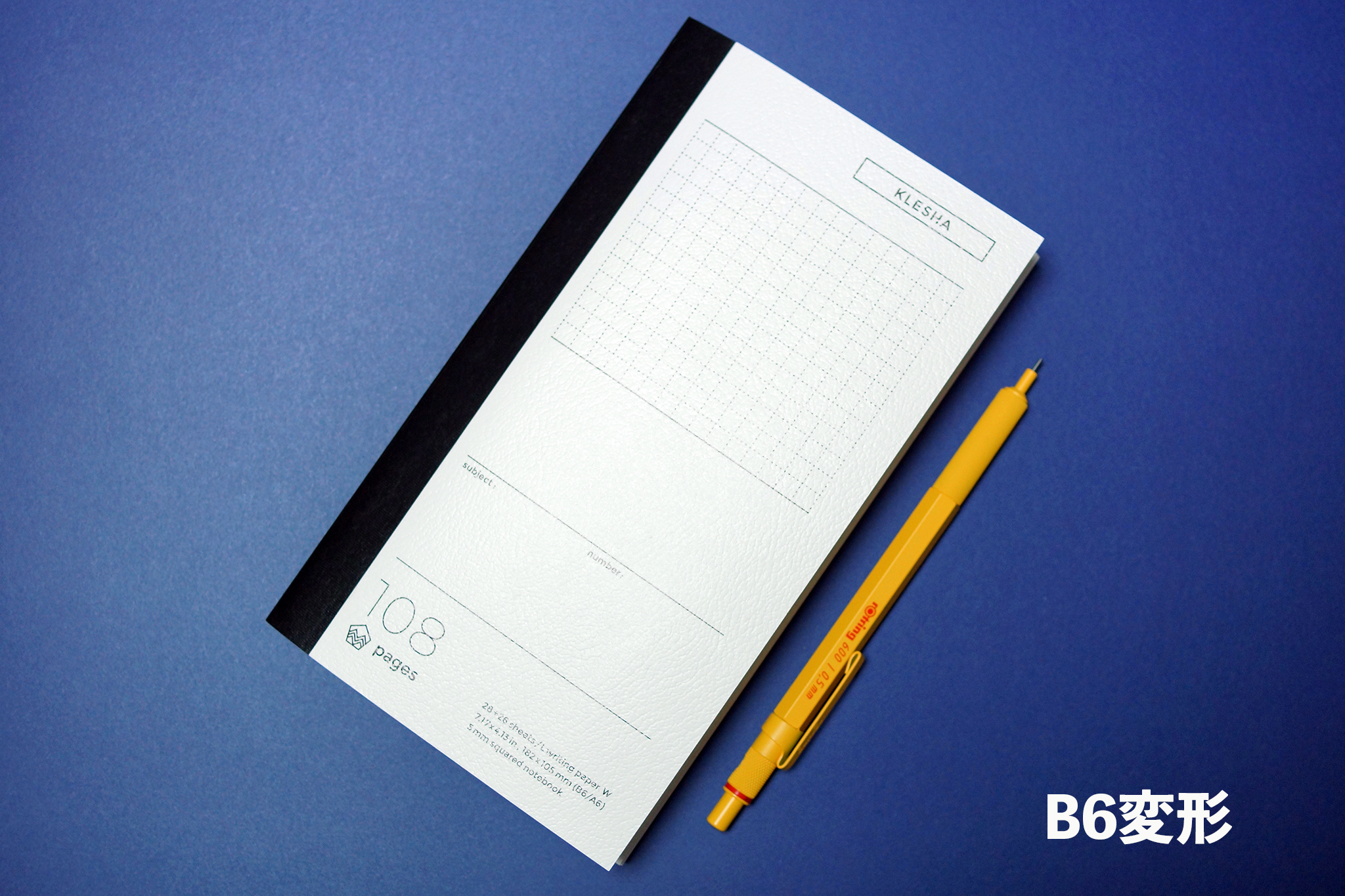 B6版というと、学習用ノートは今でもB5版が主流ですから、その半分ですね。縦182mm×横128mmですが、クレシャではこちらも横方向がスリムになっています。縦が182mm、横が105mmで、やはり幅が20mm狭いです。