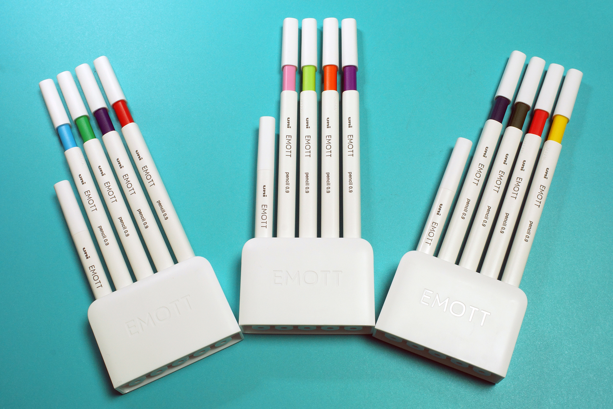 エモットは0.4ミリ樹脂チップ搭載カラーペンのシリーズから始まりましたが、カラーセットはエモットもエモットペンシルも同様のケーススタンドにペンが刺さった状態で販売されています。
