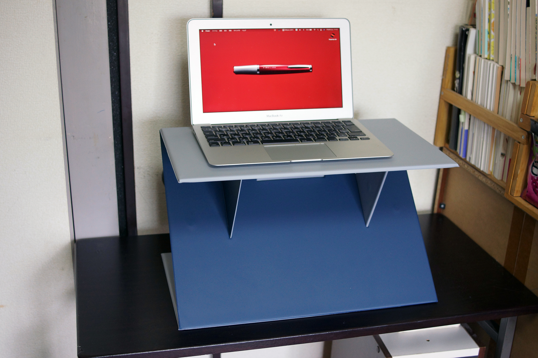 わたしの身長は168cmですが、自宅の机(高さ71cm)の机にパタスタを置いて、MacBookAirにてこの原稿を書いています。肘がやや曲がる程度でキーボードに打鍵していますが、成人男性にはパタスタはやや低いかもしれません。もう少し肘を直角に曲げたい場合は、パタスタ天面とノートパソコンの間に厚みがあってぐらつかないものを敷いて高さ調整をするほうがいいかもしれません。