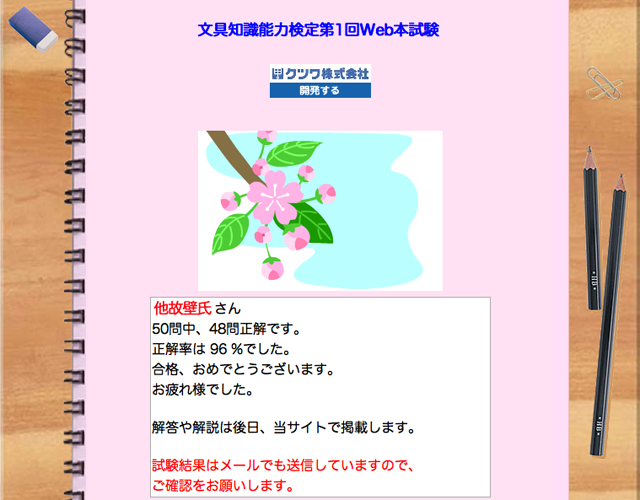 文具検定結果 第一回文具検定、終わりました。いやあ、よかったよかった。いちど間違えてブラウザのバックボタンを押してしまったときはどうしようかと思いましたが。ラジオボタンがすべてリセットされてしまって(汗)でもまあ、とりあえず知識の強化ができてよかったです。あとで復習しなくちゃ。 [0回] コメント コメントを書く コメントを書く コメント送信