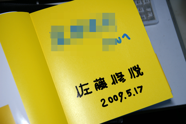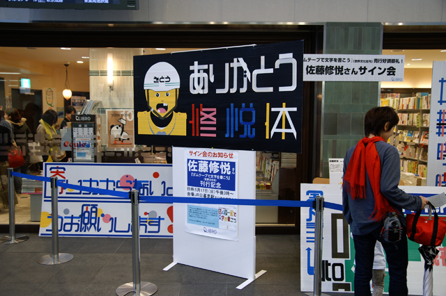 佐藤修悦さんサイン会 というわけで、日暮里駅でのサイン会は楽しゅうございました。修悦体がずらり並ぶ特設会場で。修悦さんのサイン会が。素敵すぎます。小生は列に並んだ四番目。握手、会話、サイン、記念撮影、プレゼント(!)と盛り沢山の会でした。いただいたプレゼントは「修悦体練習ボード」。貴重なダンボールです。ありがたし。サインの文字も「手書き修悦体」。本名ばっちりなのでいちおうモザイクですが、小生の名前もしっかり修悦体で書いてもらっています。ビバ! 修悦体!やっぱりすてきです! [3回] コメント コメントを書く コメントを書く コメント送信