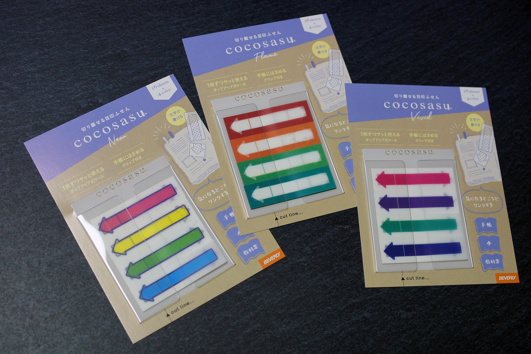 本体はカード上に薄くまとまったフィルム製で、一枚引き出すと次の付箋がセットされるポップアップタイプです。他社製品ではよく目にしますが、ココサスとしては初めてのラインアップとなります。