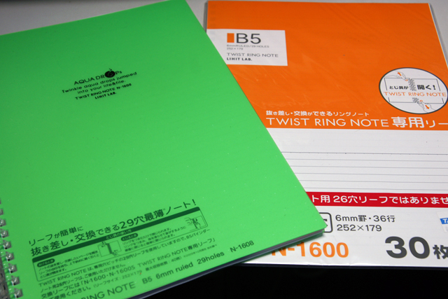 いわゆるルーズリーフ規格のB5とは穴数が違いますので(ルーズリーフは26穴、ツイストリング・ノートは29穴)他社のリーフを入れることはできませんが、それを補完して余りある程の携帯性はすばらしいと思います。