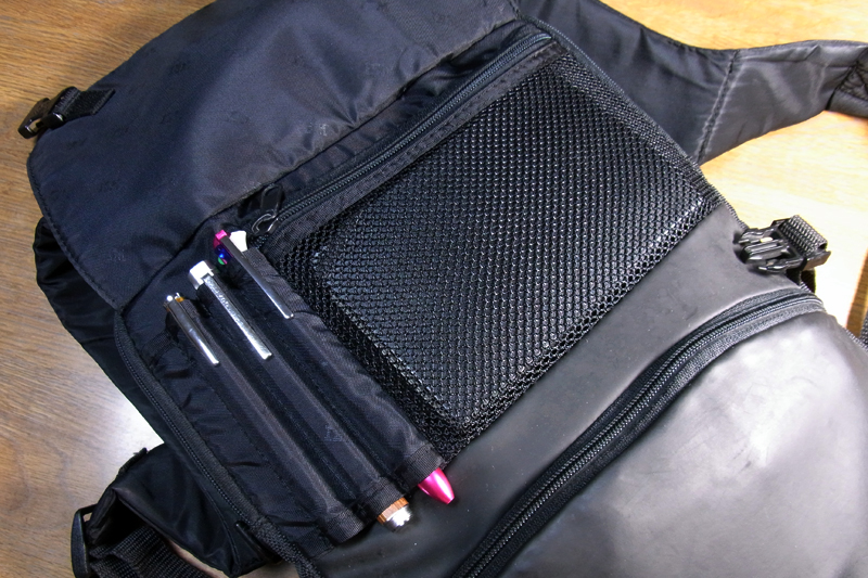 フラップの下はメッシュポケットとペン差し。このメッシュポケットがMoleskineポケットにぴったりで、まるで設えたかのような雰囲気です。