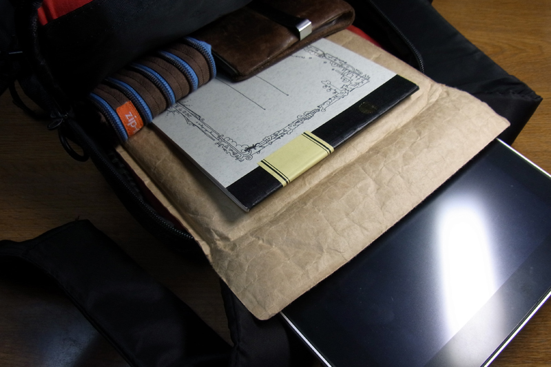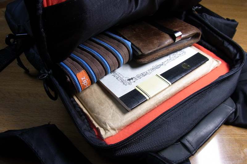 バッグ内のクッションは、薄いながらも必要充分の衝撃吸収をしてくれます。Thinking Power Notebook “Nature”とトラベラーズノート、あとはバッテリとかティッシュとかを入れたZip itを。
