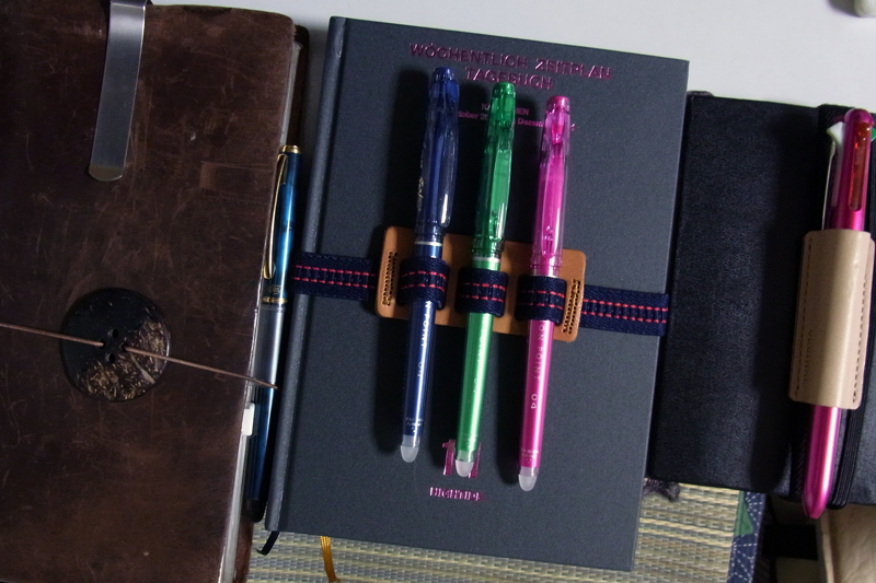 オプションで、これまたHIGHTIDEのペン差しバンドを装着し、フリクションポイント04のブルーブラック、チェリーピンク、グリーンを装着しています。