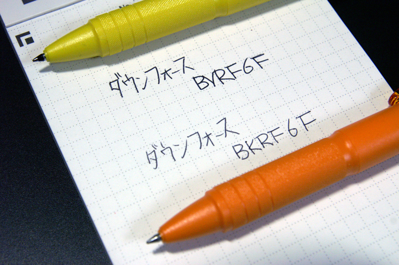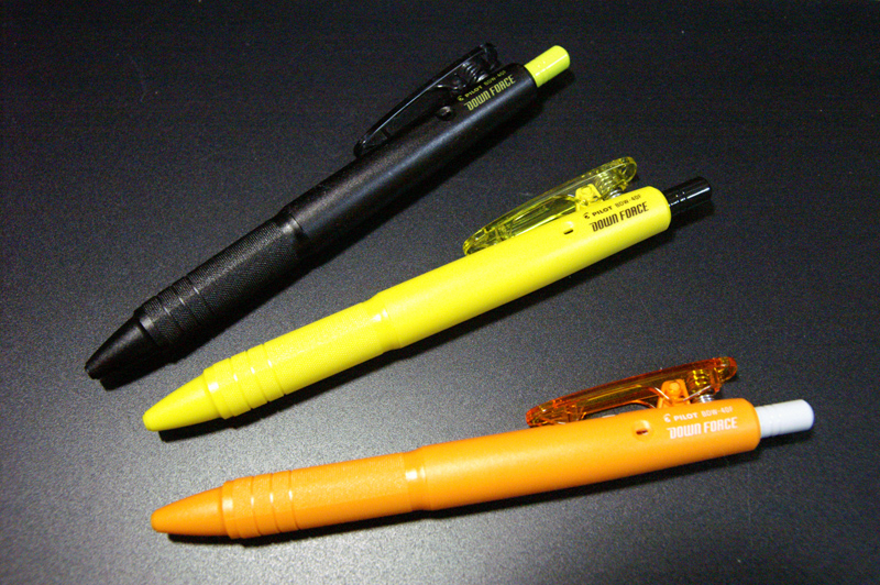 しかもダウンフォースは、パイロットの通常のノック式/多色ボールペン用のレフィルBKRF-6F-Bが使用できます。63円のレフィルで通常のノック式と同じ筆記距離、しかも加圧式で垂直筆記も可能、と。