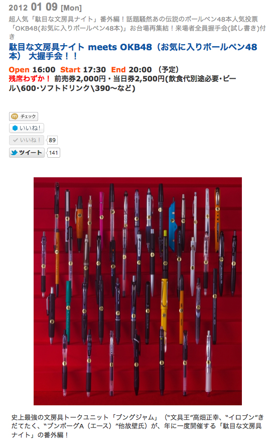 ブング・ジャムも出演する、東京カルチャーカルチャーでのトークライブ「駄目な文房具ナイト meets OKB48(お気に入りボールペン48本)大握手会!!」、「残席わずか!」インジケータ出ました!