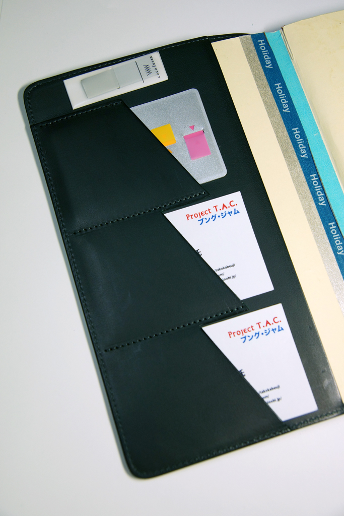 開いた左側、表2には名刺ホルダを。取り出しやすさと個性を兼ねたイナズマカットの名刺ホルダの上には、ココフセンをひとつ貼れるスペースを設けています。