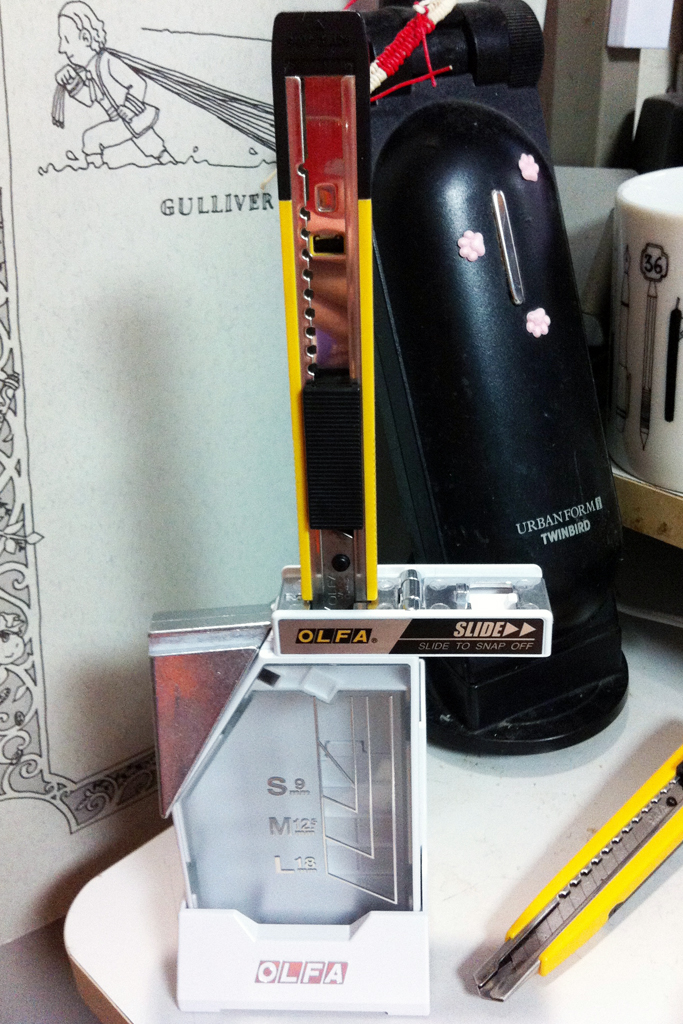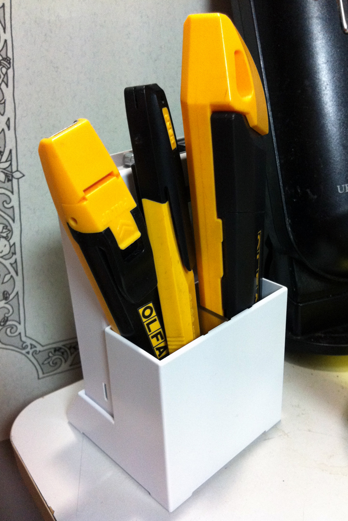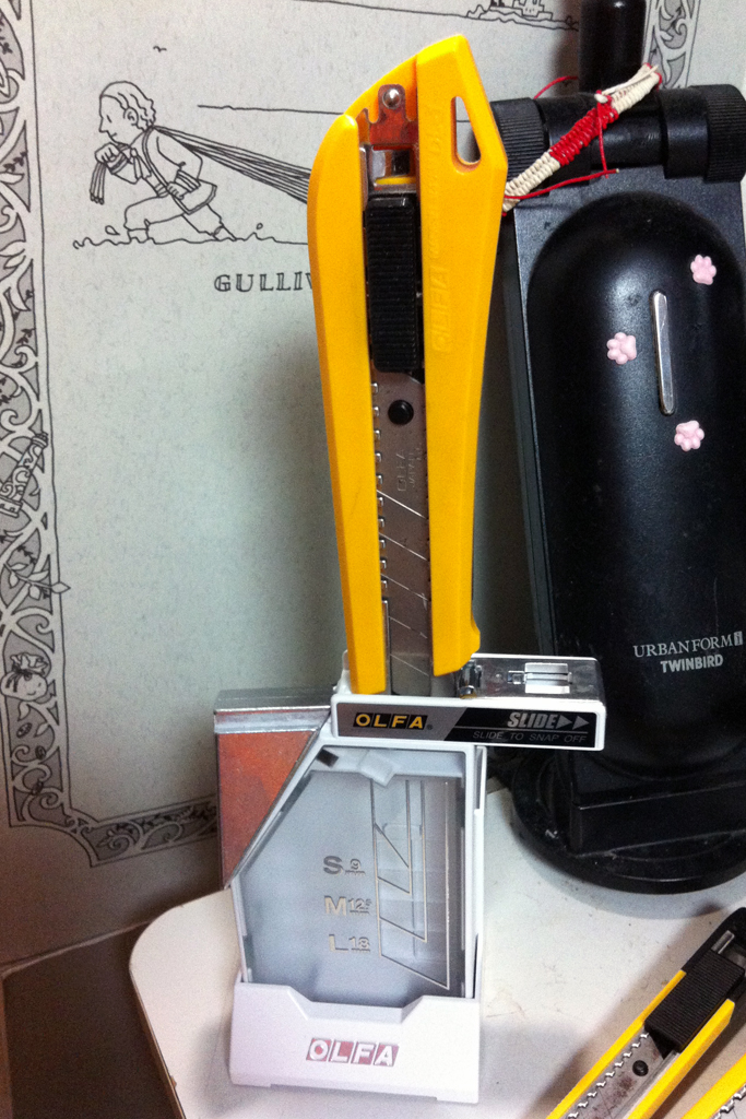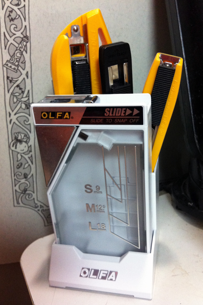裏面にスタンドがあって、そこにカッターを無造作に突っ込んでおくことが出来ます。