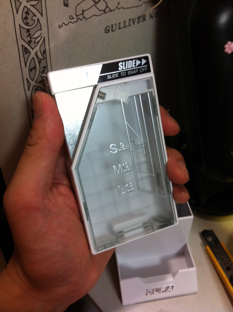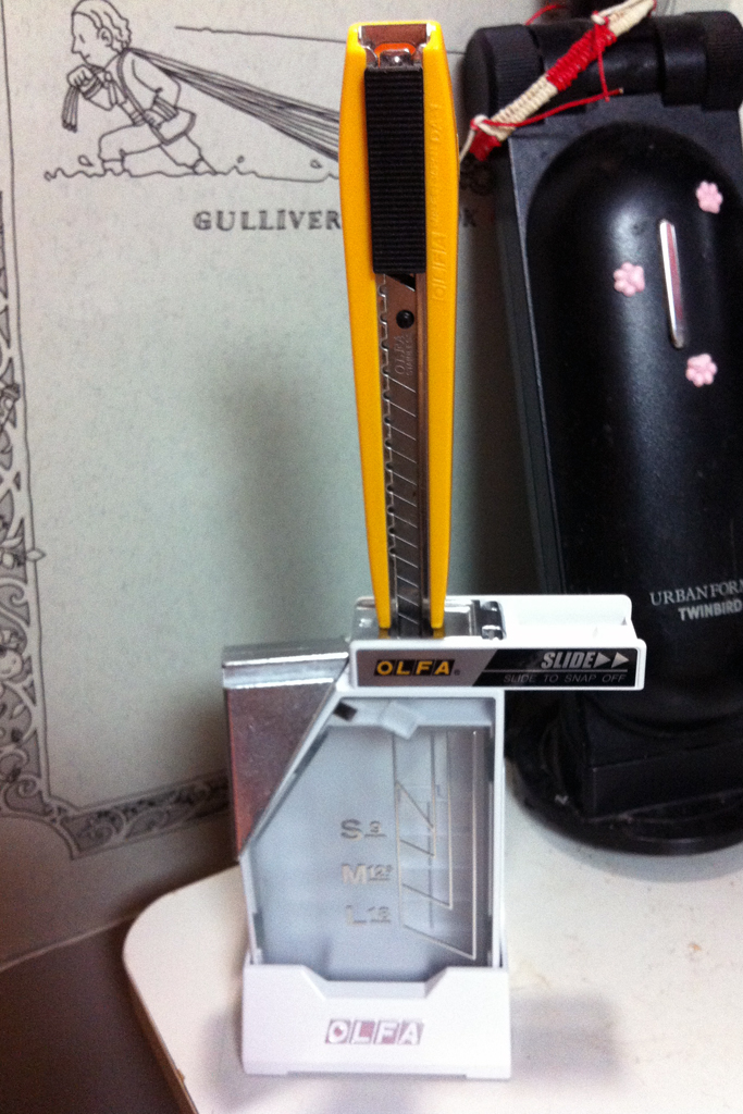 本体はこんな感じでぱこっと取り外すことができますが、刃を折る際にはベースに立てたままにしておきます。