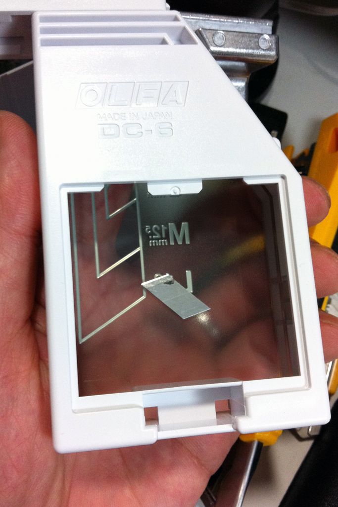 上部に金属のカバーがあり、それを折りたいカッターのサイズに合わせておくことによって、実に簡単に刃を折ることができるのです。