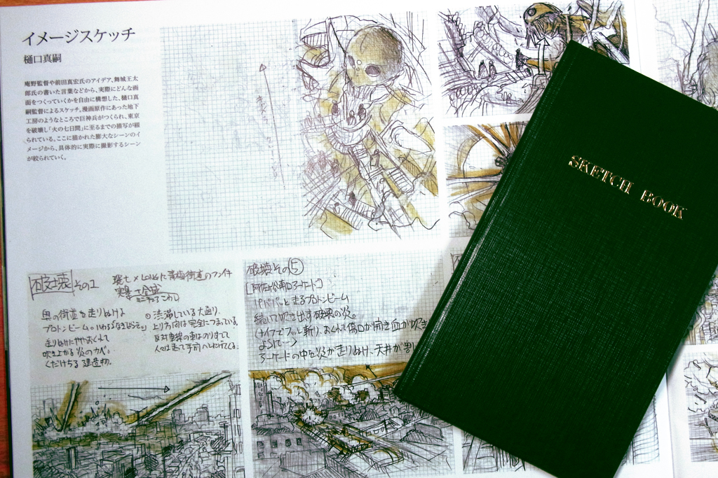 会の目玉の一つである短編映画『巨神兵東京に現わる』を撮った樋口真嗣監督が、今回の短編映画を撮るに際してラフスケッチを測量野帳スケッチブックで描いているんです。