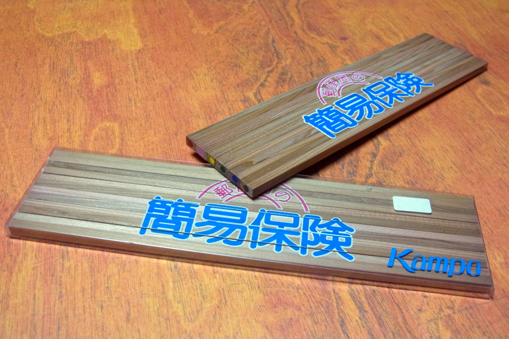 かんぽの色鉛筆。長方形の薄っぺらな色鉛筆が6本束ねられています(裏面はセロテープどめ)。