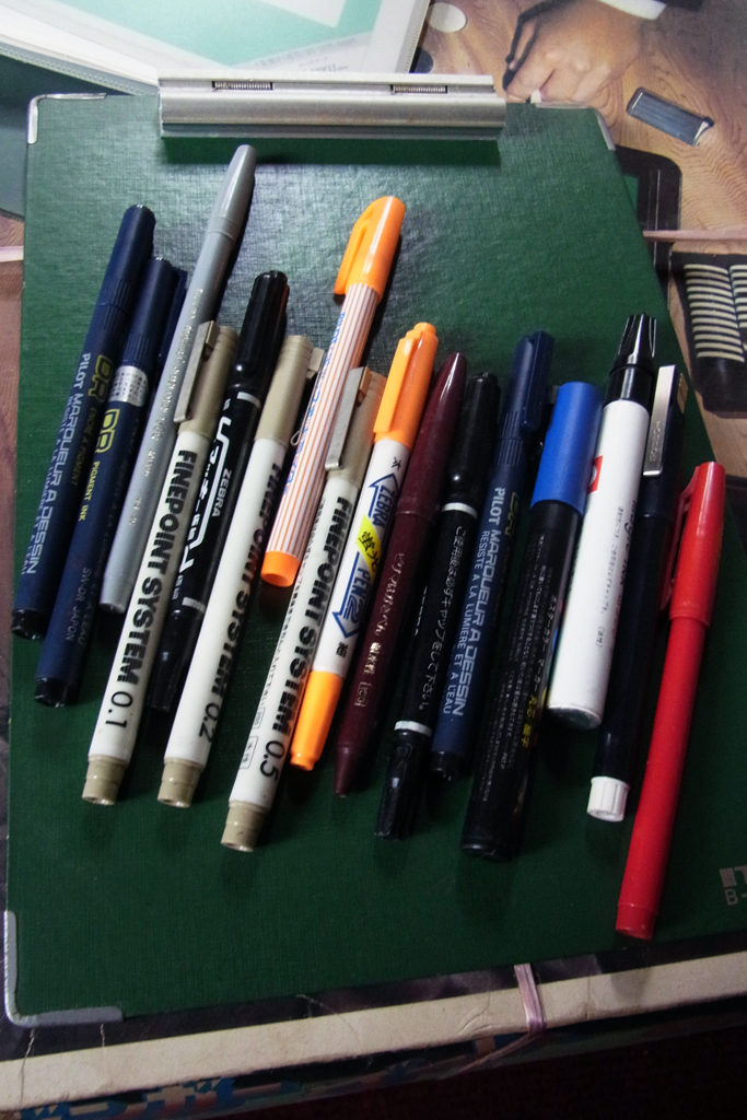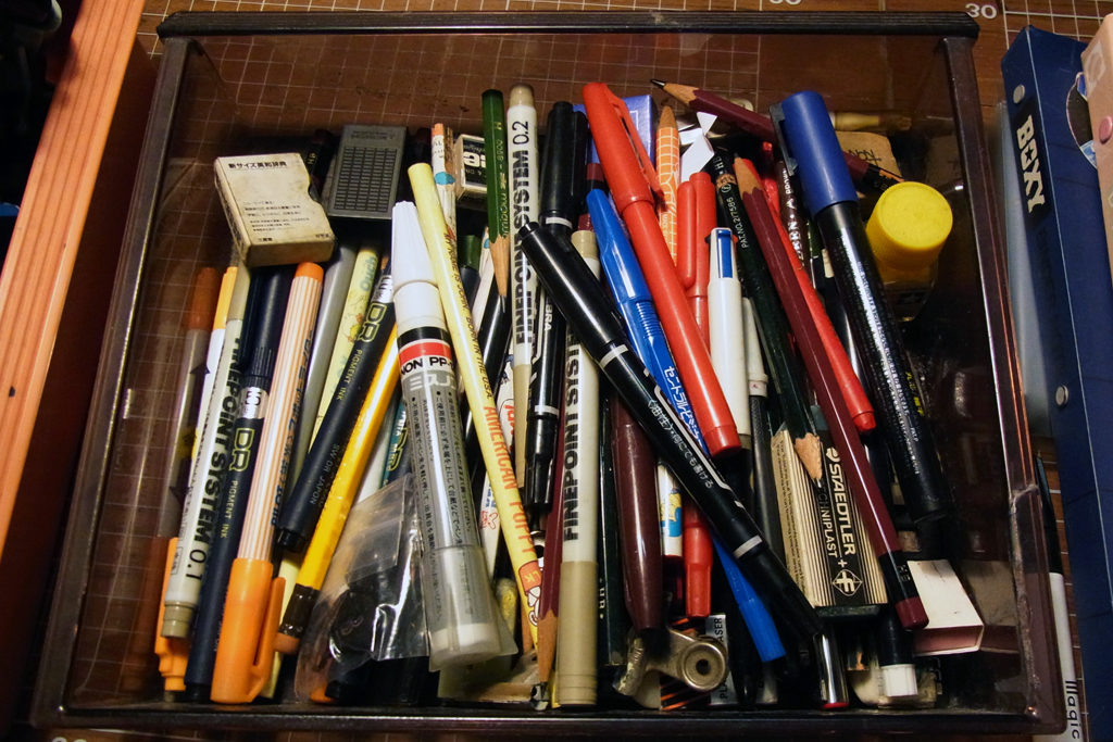 ミリペンとマーカーの類いは漫画にペン入れをするようになってからのセレクトと思われるので、この群の中では比較的新しいラインアップのはず。高校生時代から大学生時代(1982年4月〜1990年3月)のもので、東京に来てからのメインであるピグマが入っていないのが地域性なのかなあ、と。