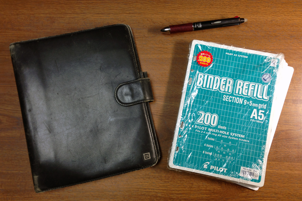 会社に入ってからしばらく、ノートはA5判6穴システム手帳を使っていました。このタイムシステムバインダも持ち歩いていたのですが、やっぱり大きくて重かったので、パイロットで出ていた合皮の軽いA5判6穴システム手帳を会議の議事録帳として永く使っていたのです。