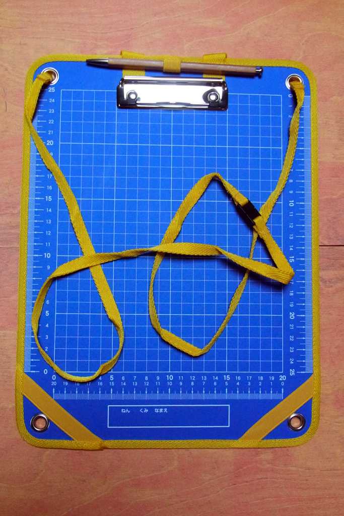 小学校の生活科における校外活動授業“まちたんけん”で使用する、クリップボードに首掛けのひもがついた便利ボードです。