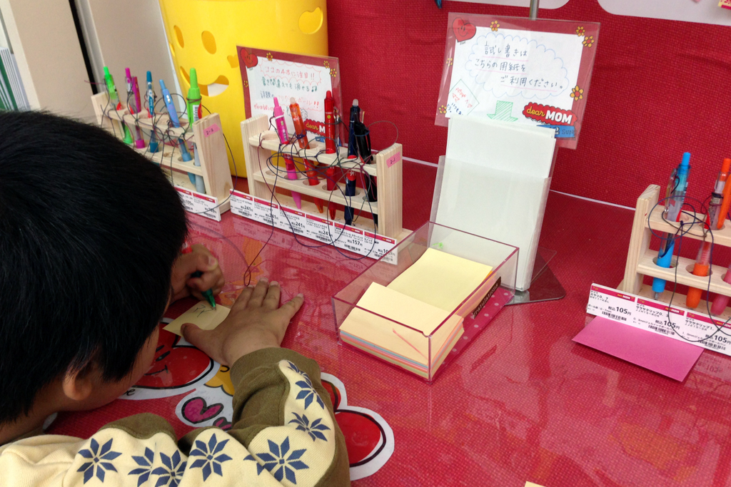 お母さんにメッセージカードを書こう! のコーナーが実に素晴らしい最新筆記具の試し書き場となっていたので、家族でがしがし書いてきました。