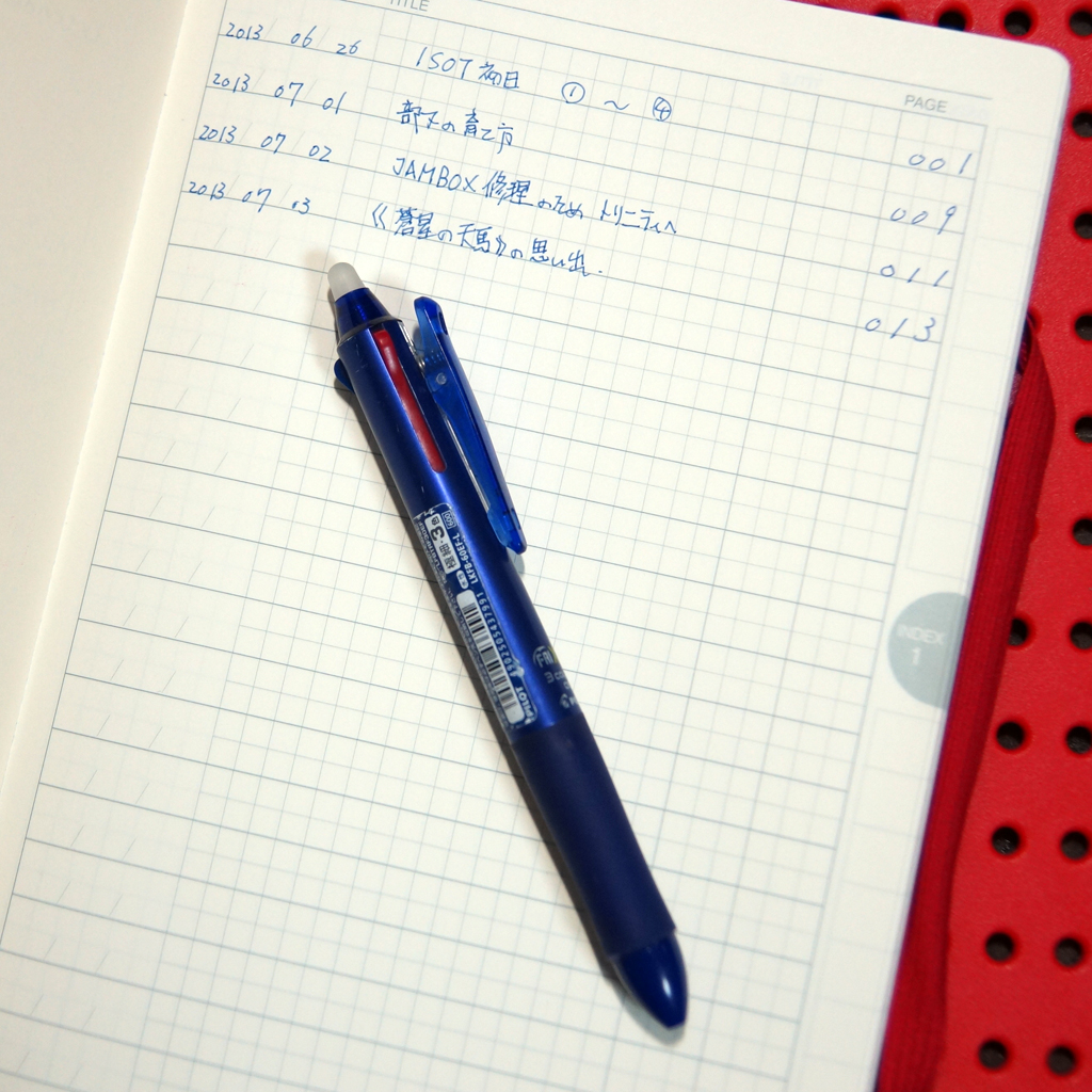 メインがフリクションボール3(0.38ミリ芯に換装済み)であり、基本的に左ページは追記/貼りつけ用にまるまる空ける使い方をしているので、裏移り等の心配はもともとないのですが、それにしてもいい紙です。消し心地もいいですね。