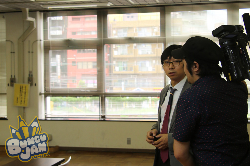 開始前、テレビ東京「ソロモン流」のテレビクルーと打ち合わせをする文具王。