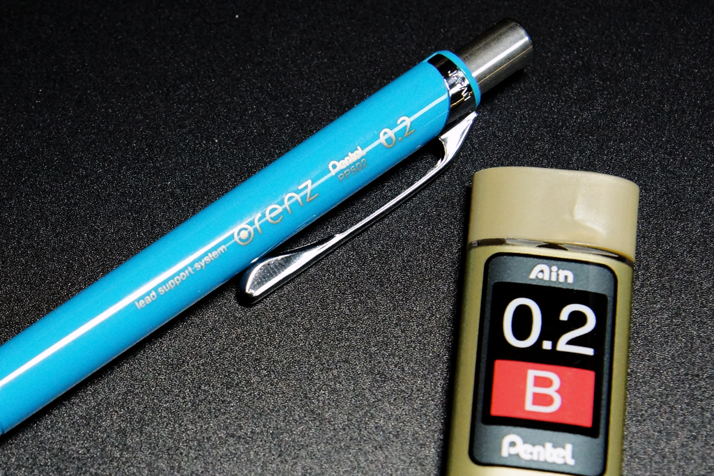 ひさびさに市場に帰ってきた0.2mm芯のシャープペンシルですが、芯の凄さもさることながら、ペン先のガイドパイプが筆記に準じて引っ込む「オレンズシステム」が秀逸です。