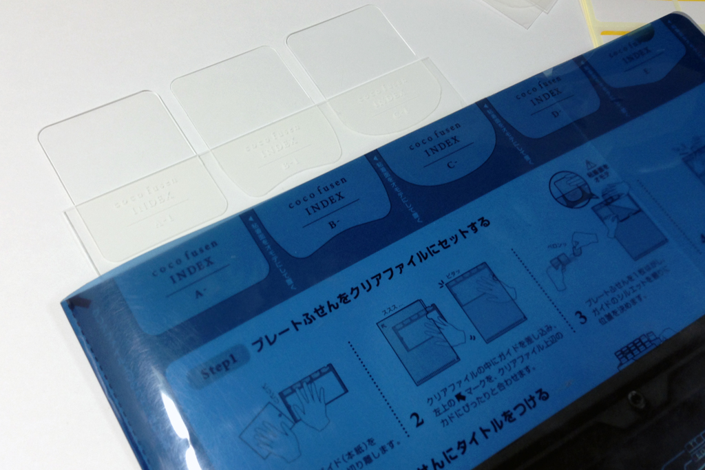 説明書をクリアホルダーの上端に合わせるようにして滑り込ませ、シート(「プレートふせん」という名前がついています)を1枚、台紙から剥がします。そしてそこのガイド絵に合わせてホルダー内部に接着──ぎゅっと押しつけます。