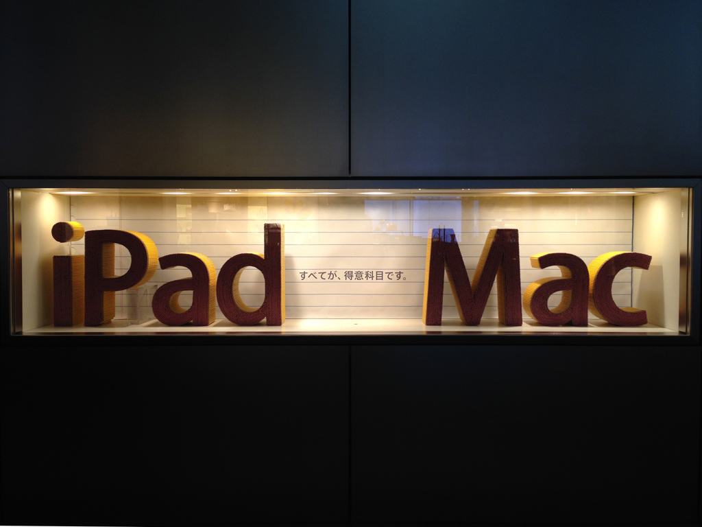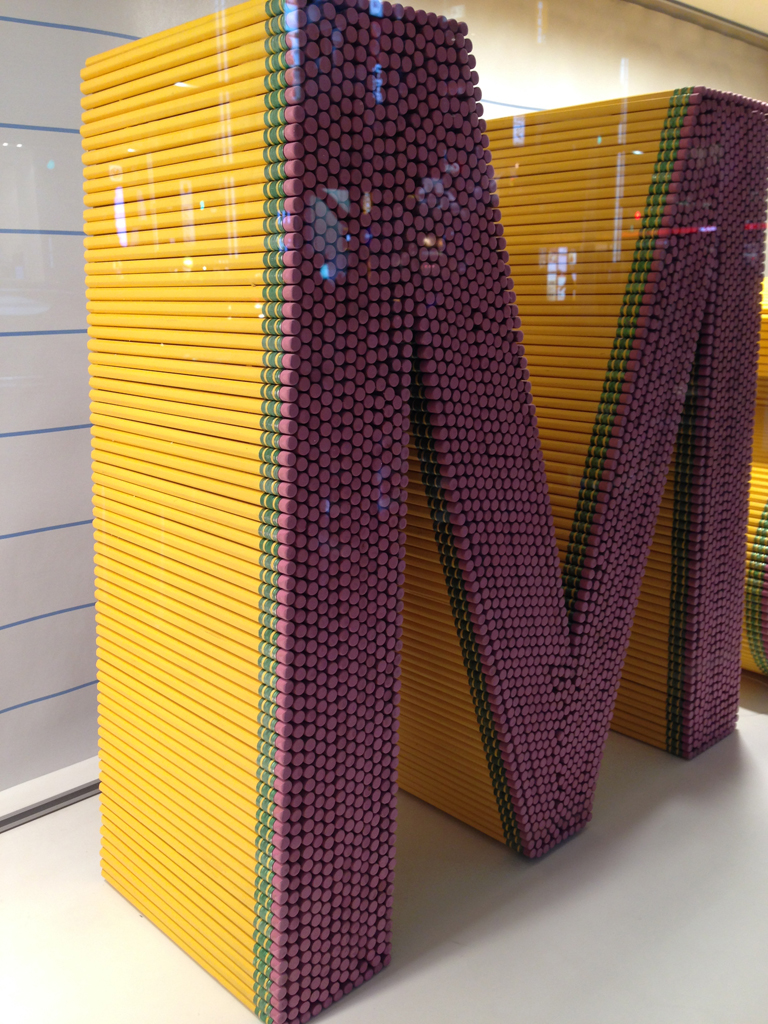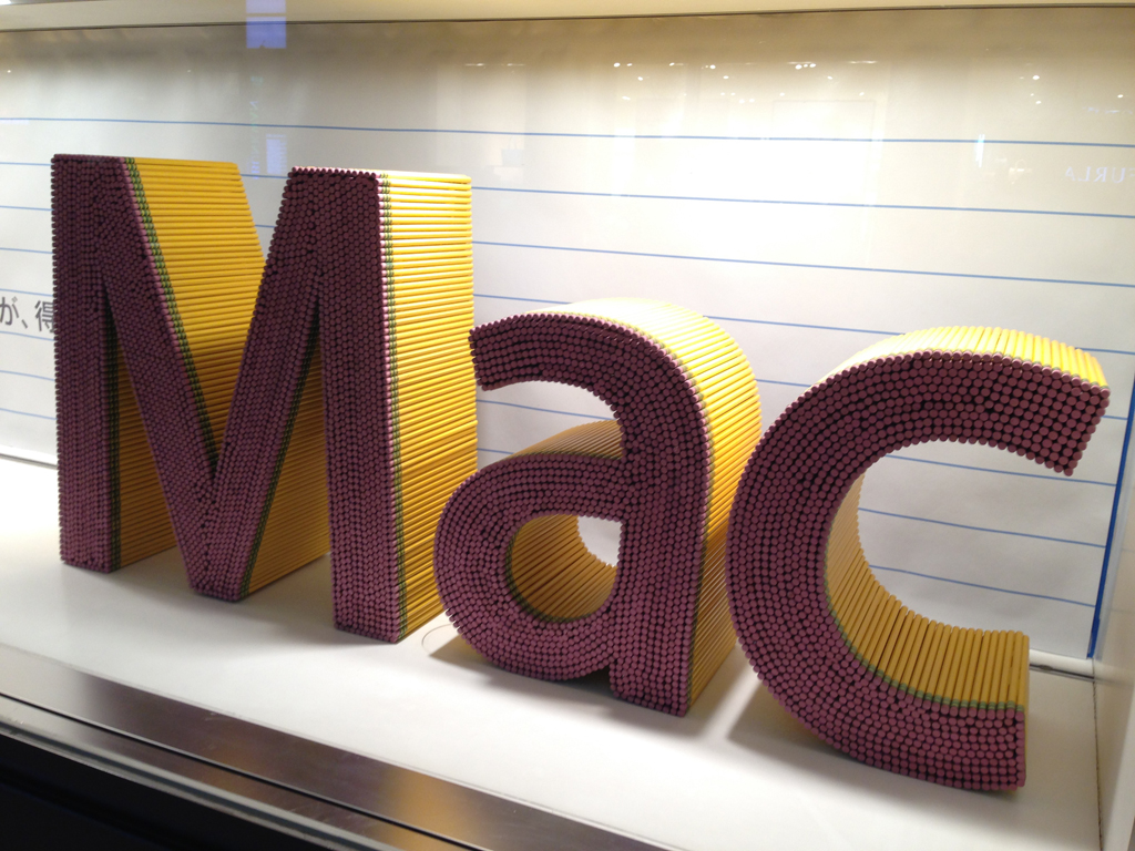 2月からアップルストア銀座のウインドウに飾られている、イエローペンシルのオブジェたち。