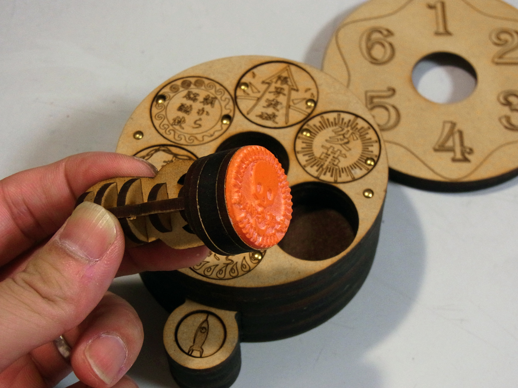 ロケットの基部にある強力磁石と、ハンコに内蔵されている強力磁石が吸い寄せられてスタンプになります。