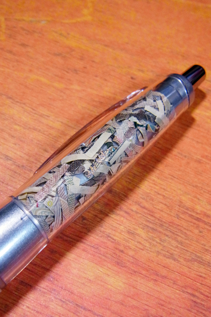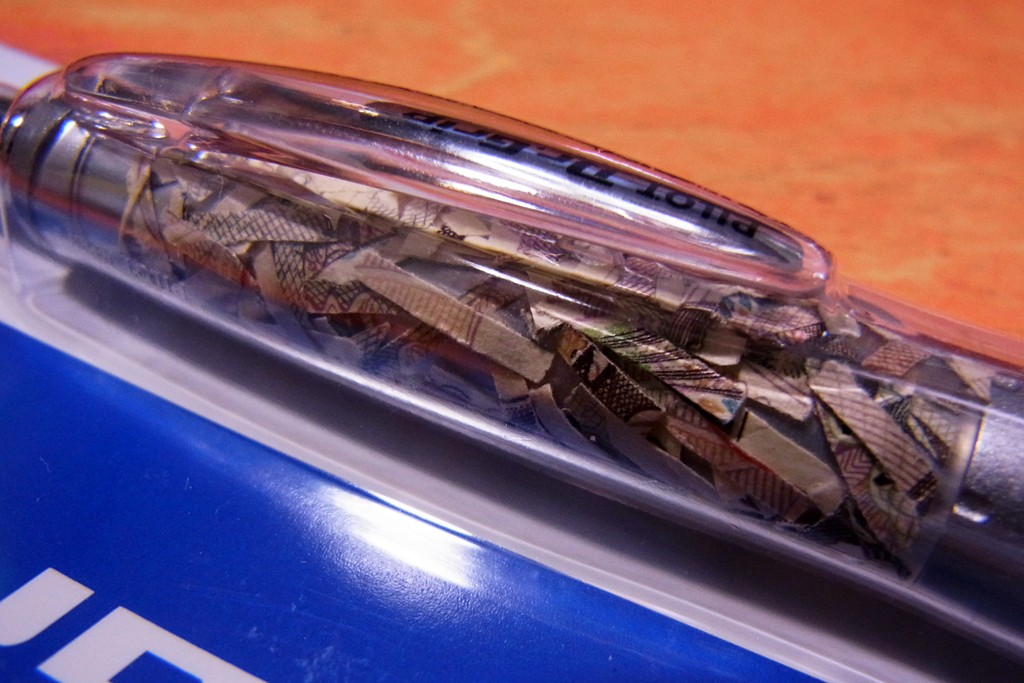 Dr.グリップGスペックの軸内に、痛んだりして使えなくなった紙幣の裁断された断片が仕込まれているのです。