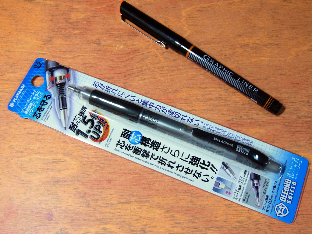 グラフィックライナーは「そういえばこれも水性ボールペンだったよなあ」と思い出し購入。最も、0.05や0.1、0.3はどれを試し書きしても納得のいく黒さが出ず、「おかしいなあ、こんな色だったっけ……」と悩みつつ0.5を選びました。
