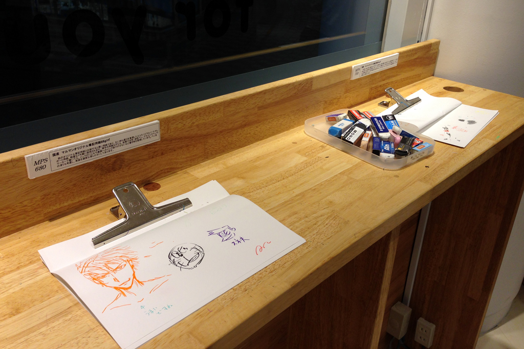 廊下と店内を隔てるガラス張りの壁面に、試し書きコーナーがあります。