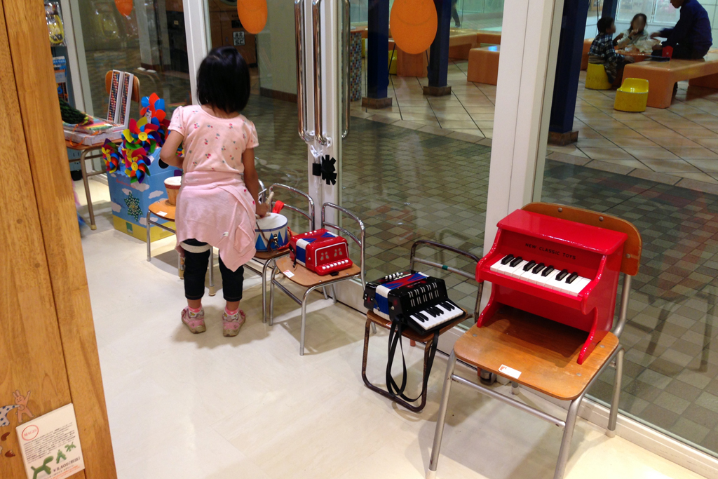 背の低い木製の壁で仕切られた幼児文具コーナーや、窓側にある幼児楽器コーナーなど、客層(ちいさいお子さんを連れている若いご夫婦がけっこうな率でいらっしゃいました)をよく把握された構成になっています。