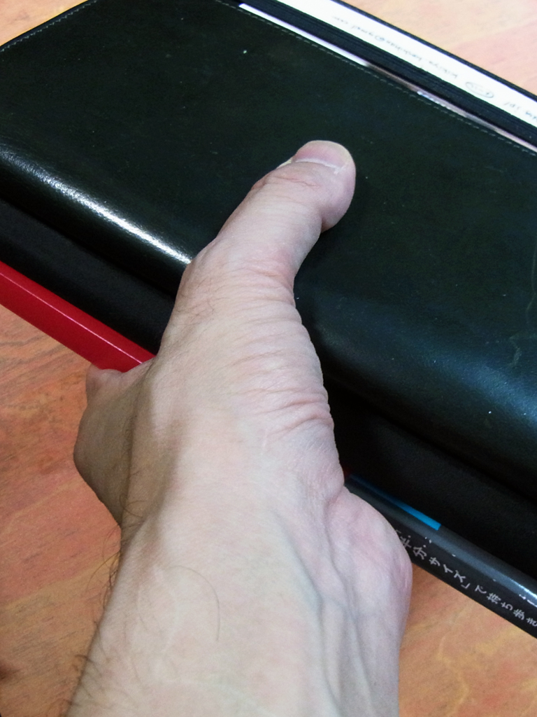 ただ、分厚い手帳と分厚いノートとかなりの枚数の入るフォルダーですから、小さいわりには重さがあります。