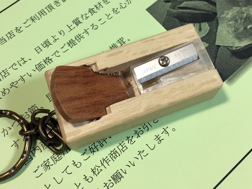 白樫の鉛筆削りはご覧の通り、鰹節削りをミニチュアにしてその中に鉛筆削りを仕込んだものです。