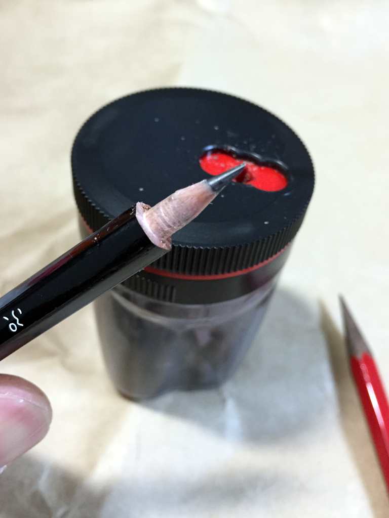 側面から見て、この中に見える赤いラインまで鉛筆の後端が届くように削っていきます。
