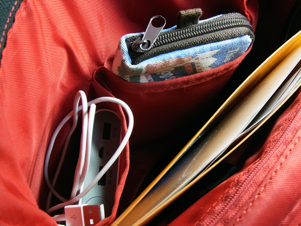 オフで背負ういつものバックパックには、中にふたつ小ポケットが並んでいます。